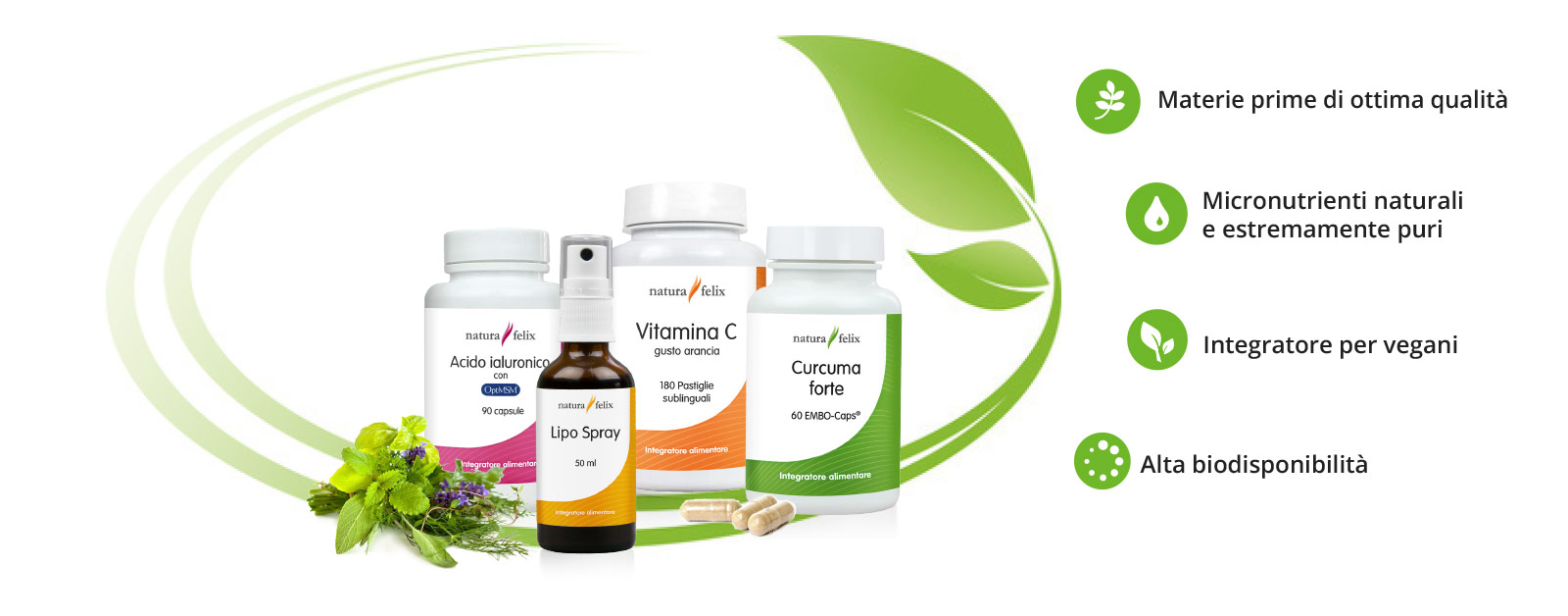 Leggi di più >I prodotti natura felix contengono solo i principi attivi puri. Sono privi di glutine, lattosio, fruttosio. Non utilizziamo né coloranti, né aromatizzanti artificiali.